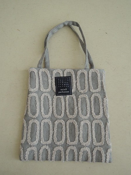 デザイン:mina perhonenのgrass windowシリーズのミニバッグです。カラーはグレー地にライトグレーのパイル刺繍が一面に施されたデザインで、内側は光沢のあるベージュグレーの裏地であしらわれています。素材は表地 毛100%、刺繍部分 アクリル60%、毛40%、裏地 ポリエステル100%です。
