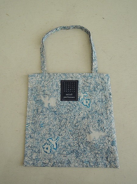 デザイン:mina perhonenのunforgettable momentシリーズのミニバッグです。カラーはライトベージュベースに濃淡ブルー・ブラックで手書き風の総柄が施されたデザインで、内側は光沢のある濃い水色の裏地があしらわれています。素材は表地 綿100%、裏地 ポリエステル100%です。