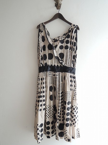 デザイン:mina perhonen「universe」のドット柄ワンピースです。カラーはグレーベージュ×ブラックのドット柄で、フッ素コーティング加工の施された生地であしらわれております。バックフック&ファスナーで着脱でき、フロントはカシュクールデザインで、上部ボタン留め付きです。スカート部に裏地付きです。 (掲載写真は、実商品のカラーにできるだけ近づけるよう努力はしておりますが、お使いのモニターや画面設定等によっては、色が異なって見える場合もございますので、予めご了承下さい)