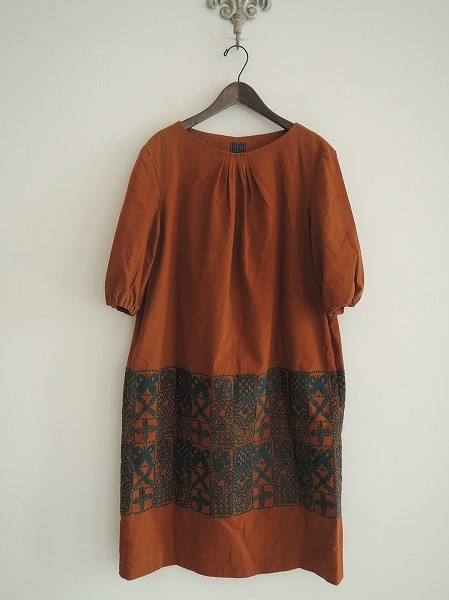 デザイン:mina perhonen 「forest tile」の刺繍ワンピースです。カラーはブラウンで、しっかりとした生地であしらわれており、青緑の刺繍が施されております。前後襟中央はタック入りで、両腰にはポケットがあり、袖口はゴム入りになっております。 (掲載写真は、実商品のカラーにできるだけ近づけるよう努力はしておりますが、お使いのモニターや画面設定等によっては、色が異なって見える場合もございますので、予めご了承下さい)