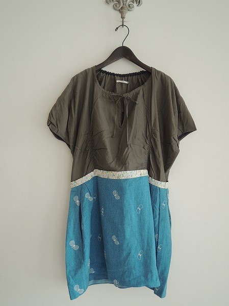 デザイン:mina perhonen 「moonlit」の切り替えワンピースです。カラーは上身頃がグレーで、スカート部分はブルー系のチェック織りベースにホワイトで蝶の刺繍が施されています。ウエスト部分には 「jellybeans」のテキスタイルの別布があしらわれ、上身頃にはゴムシャーリングが施されています。 (掲載写真は、実商品のカラーにできるだけ近づけるよう努力はしておりますが、お使いのモニターや画面設定等によっては、色が異なって見える場合もございますので、予めご了承下さい)