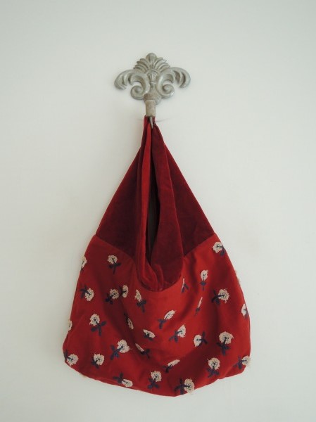 デザイン:mina perhonenのskipシリーズのクラウンバッグです。カラーは落ち着いたレッド地にベージュ・ダークグリーンのお花の刺繍が全体に施されたデザインで、持ち手部分はレッドの別珍素材に切り替わっています。持ち手トップにはレザーのボタンが施されており、取り外し可能です。内側はくすんだ朱色でポケットが4つございます。素材は表生地が綿100%、刺繍部分が綿65%・アクリル20%・毛15%、裏生地が麻100%です。