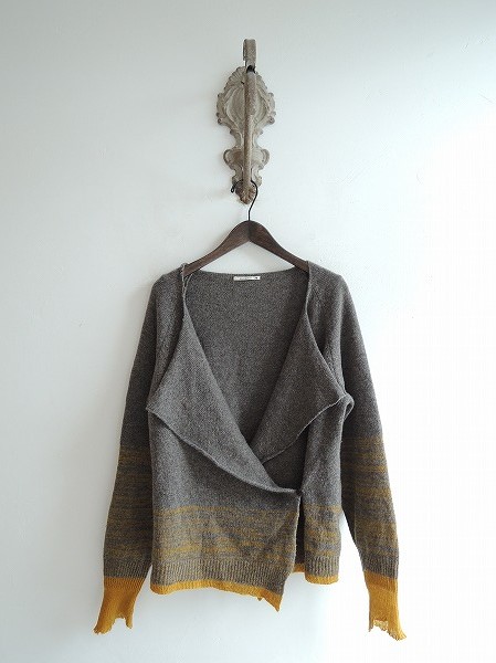 デザイン:mina perhonen 「snug」のカシミヤニットカーディガンです。カラーはミックスグレー×山吹で、フロント両サイド内外のボタンで着脱します。 (掲載写真は、実商品のカラーにできるだけ近づけるよう努力はしておりますが、お使いのモニターや画面設定等によっては、色が異なって見える場合もございますので、予めご了承下さい)