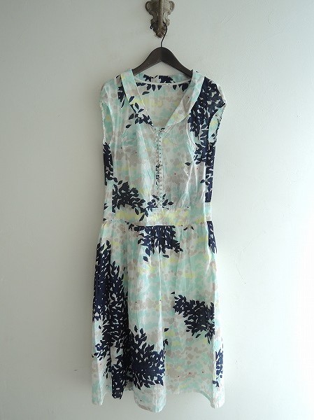 デザイン:mina perhonen 「water lily」の総柄ワンピースです。カラーはオフホワイトに、紺・ベージュ・水色・朱・薄黄などの総柄プリントで、透け感のある薄手素材です。左脇下のファスナーやフロントの編み上げで着脱でき、ウエストに切替えやギャザーがあしらわれ、スカート部分のみ裏地が付いております。 (掲載写真は、実商品のカラーにできるだけ近づけるよう努力はしておりますが、お使いのモニターや画面設定等によっては、色が異なって見える場合もございますので、予めご了承下さい)