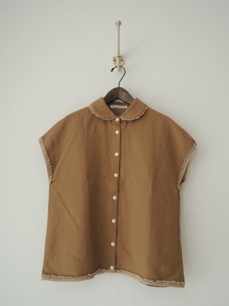 デザイン:2014年春夏コレクション mina perhonen 「lschia」のブラウスです。カラーはブラウン系で、フロントボタン開閉です。襟まわり・袖口・裾にはレースがあしらわれています。定価22,000円+税の商品です。 (掲載写真は、実商品のカラーにできるだけ近づけるよう努力はしておりますが、お使いのモニターや画面設定等によっては、色が異なって見える場合もございますので、予めご了承下さい)