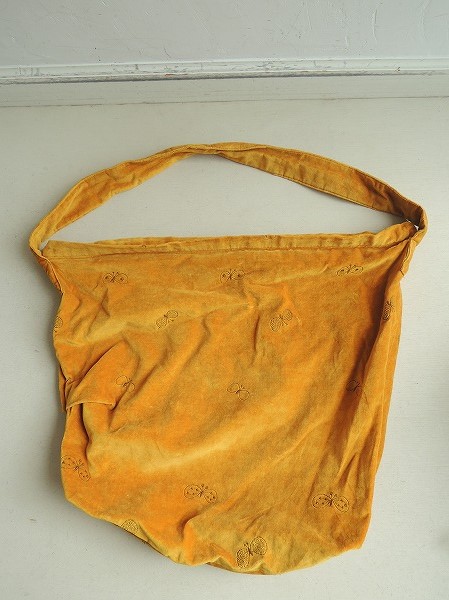 デザイン:mina perhonenのchouchoシリーズのボディバッグ大です。カラーは黄土色の滑らかな別珍素 材に、カーキブラウンで蝶々の刺繍が施されたデザインで、開閉ファスナーにシルバーの小鳥のモチーフがあしらわれています。内側にはカーキ系の裏地とポケットが1つ付いています。素材は表生地・刺繍部分・裏生地共に綿100%です