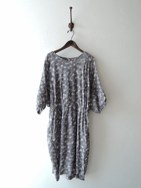 デザイン:2014年 春夏コレクション mina perhonen 「aalto」のワンピースです。カラーはライトベージュベースにグレー系の総柄プリントで、やや透け感のある薄手素材であしらわれています。背ボタンで着脱し、ドルマンスリーブで、袖口&ハイウエスト辺りにはゴムが通っています。裏地はなく、定価52,000円のお品です。 (掲載写真は、実商品のカラーにできるだけ近づけるよう努力はしておりますが、お使いのモニターや画面設定等によっては、色が異なって見える場合もございますので、予めご了承下さい)
