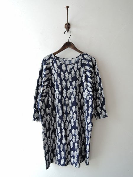 デザイン:mina perhonen 「snow candle」のチュニックです。カラーはムラ感のあるネイビー×オフホワイト×ホワイト×グレー系の総柄プリントで、カットソー素材であしらわれています。 (掲載写真は、実商品のカラーにできるだけ近づけるよう努力はしておりますが、お使いのモニターや画面設定等によっては、色が異なって見える場合もございますので、予めご了承下さい)