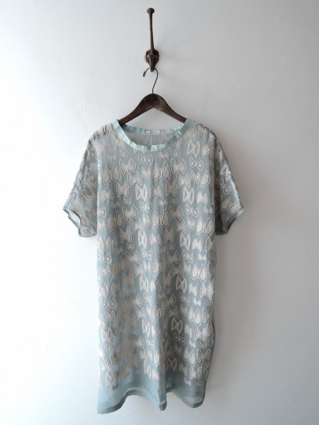 デザイン:mina perhonen 「sky flower」のチュニックです。カラーは淡いグレーブルーで、透け感のある絹の楊柳素材ベースに、ベージュで蝶の刺繍があしらわれております。ネック部分にはグログランテープでパイピングが施されており、裏地はございません。 (掲載写真は、実商品のカラーにできるだけ近づけるよう努力はしておりますが、お使いのモニターや画面設定等によっては、色が異なって見える場合もございますので、予めご了承下さい)