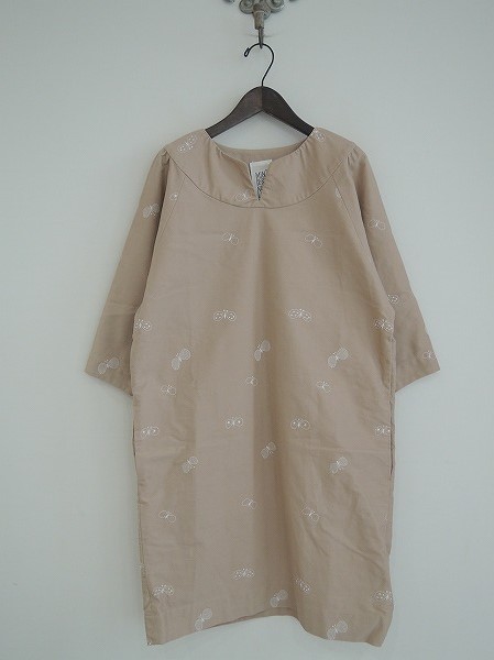 デザイン:ミナペルホネンランドリー 「choucho」の刺繍ワンピースです。カラーはややピンクがかったベージュで、ホワイトの刺繍が施されています。プルオーバータイプのデザインで、両腰サイドにポケットが付いています。定価39,900円の商品です。 (掲載写真は、実商品のカラーにできるだけ近づけるよう努力はしておりますが、お使いのモニターや画面設定等によっては、色が異なって見える場合もございますので、予めご了承下さい)