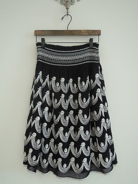 デザイン:mina perhonen 「twitter」の刺繍スカートです。カラーはブラックのメッシュチュール素材に、ホワイトの刺繍が施され、ウエストはゴム入りでスモッキング刺繍されています。左脇ファスナー着脱で、裏地付きです。 (掲載写真は、実商品のカラーにできるだけ近づけるよう努力はしておりますが、お使いのモニターや画面設定等によっては、色が異なって見える場合もございますので、予めご了承下さい)