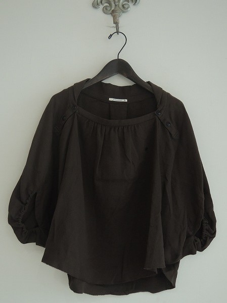 デザイン:mina perhonen 「souffle」のブラウスです。カラーはカーキがかったダークブラウンで、やや薄手の素材です。フロントの両肩のボタン開閉で、袖口の後ろのみゴム入りです。 (掲載写真は、実商品のカラーにできるだけ近づけるよう努力はしておりますが、お使いのモニターや画面設定等によっては、色が異なって見える場合もございますので、予めご了承下さい)
