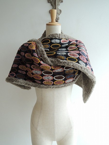 デザイン:mina perhonenのtarteシリーズのボア付きストールです。カラーは濃紺の細かなメッシュ生地にピンク・イエロー・ブラウン等のカラフルな刺繍が一面に施された生地をライトグレーベージュのボア生地にあしらったデザインです。