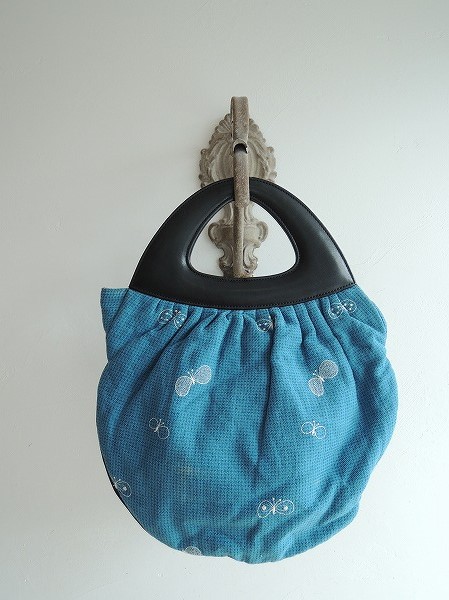 デザイン:mina perhonenのchouchoシリーズのシェルバッグです。カラーは濃い水色のミックス地にホワイトの蝶々の刺繍が施されたデザインで、持ち手と底部にブラックのレザーがあしらわれています。マグネットボタン開閉で、内側はナチュラルベージュの裏地にポケットが1つ施されています。素材は表地 リネン55%、絹45%、刺繍部分 綿100%、裏地 リネン100%、レザー 牛革です。