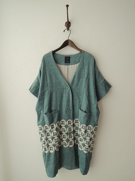 デザイン:mina perhonen [dear]の半袖羽織りコートです。カラーはブルーグリーン、フロントボタンで着脱でき、裾辺りに刺繍が施されております。定価は75,600円です。