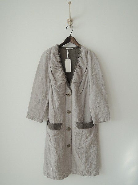 デザイン:mina perhonen 「Kailas」のロングコートです。カラーはグレーで薄手生地であしらわれており、裏地はチャコールグレーの薄手ニット地です。衿元は切りっぱなしの裏地がフリンジのようになっており、フロントボタン開閉で着脱できます。