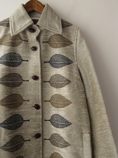 デザイン:mina perhonen「happa」の毛混ロングコートです。カラーはグレーベージュのコーデュロイ生地で、カーキ、ネイビー、こげ茶の葉っぱ模様の刺繍があしらわれています。フロントボタンで着脱でき、裏地はオフホワイトとくすんだ青のストライプ柄です。左胸に内ポケット、両腰にポケット付きで、バックスリット28cmです。