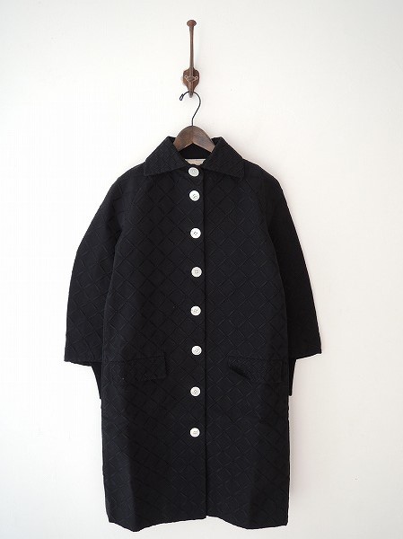デザイン:mina perhonen 「hana tile」の刺繍入りコートです。カラーはブラックで、同カラーの格子状の刺繍があしらわれております。フロントボタンで、両サイドにフラップポケットがあります。裏地は白×ブルーのボーダーで、袖口はリブニットに切り替えられています。(掲載写真は、実商品のカラーにできるだけ近づけるよう努力はしておりますが、お使いのモニターや画面設定等によっては、色が異なって見える場合もございますので、予めご了承下さい)