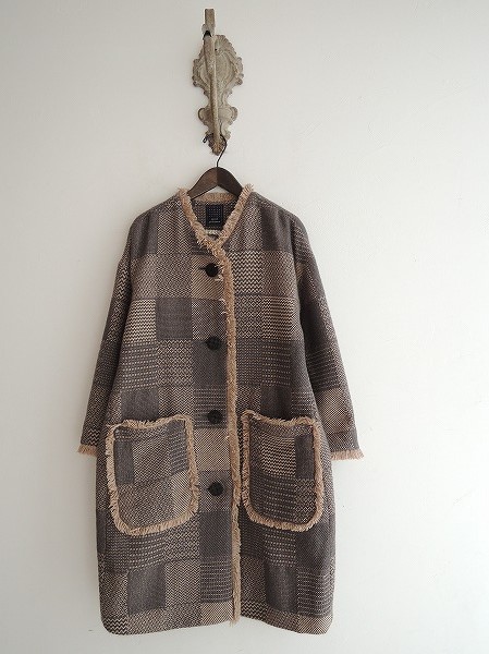 デザイン:mina perhonen 「agora」のアンゴラコートです。カラーは濃グレー×ベージュで、柄編みの柔らかな手触りのニットであしらわれております。フロントボタン開閉で、両腰にパッチポケットが付いており、裏地は「sleeping rose」柄です。(掲載写真は、実商品のカラーにできるだけ近づけるよう努力はしておりますが、お使いのモニターや画面設定等によっては、色が異なって見える場合もございますので、予めご了承下さい)