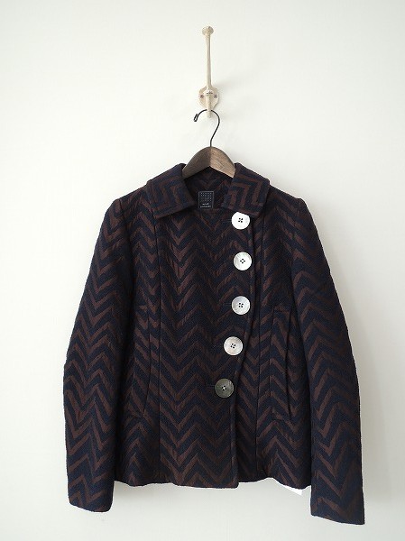 デザイン:mina perhonen 「cascade」のジャケットです。カラーはネイビー×ブラウンの柄織で、フロントボタンです。フロントに2つと左胸内側に1つポケットがあり、裏地付きです。