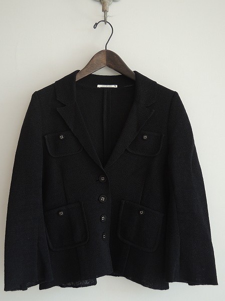 デザイン:mina perhonen 「nostalgia」のリネンニットジャケットです。カラーはブラックで、ニット地であしらわれております。フロントボタン開閉で、ポケットは4つ付いており、裏地は付いておりません。バック裾に10cmのスリット入りです。(掲載写真は、実商品のカラーにできるだけ近づけるよう努力はしておりますが、お使いのモニターや画面設定等によっては、色が異なって見える場合もございますので、予めご了承下さい)