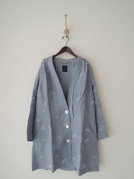 デザイン:mina perhonen 「choucho」の薄手ジャケットコートです。カラーはくすんだ水色で、全体に蝶の刺繍があしらわれております。フロントボタンで着脱でき、両サイドにポケットがございます。裏地はございません。