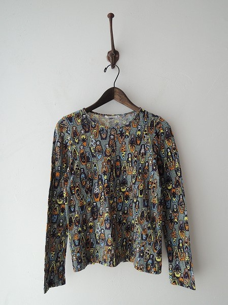 デザイン:mina perhonen「matryoshka」のTシャツです。カラーはグレーグリーンベースにプラム・オレンジ・ライトイエロー・サックス・ブラックなど様々なマトリョーシカがプリントされた薄手生地であしらわれております。定価15750円の商品です。
