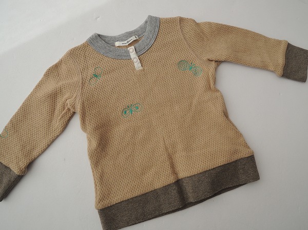 デザイン:mina perhonen 「choucho」の刺繍カットソーです。ベージュベースの薄手生地にエメラルドグリーンのブランドロゴ刺繍が施されており、リブ部は杢グレー&杢ブラウングレーのリブ地に切替えられております。子供用アイテムです。