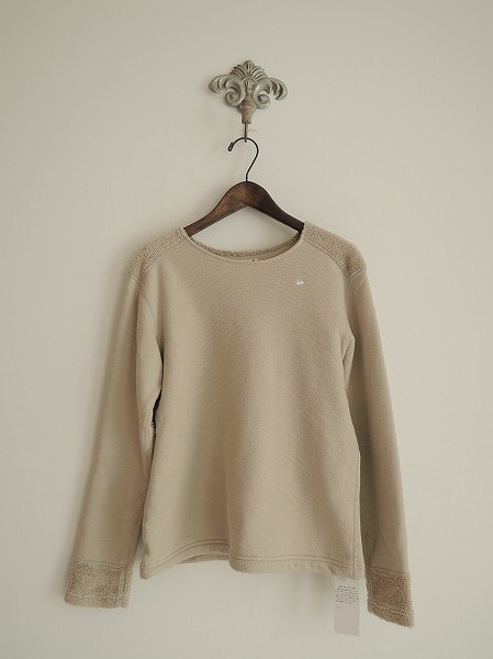 デザイン:mina perhonen「winter herb」の綿トレーナーです。カラーはベージュです。左胸に蝶のモチーフの刺繍がございます。定価は16,800円です。