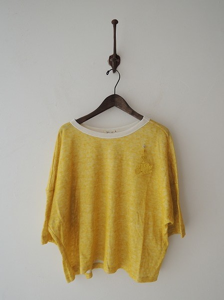 デザイン:2013年SSコレクションmina perhonen「wafer」のカットソーです。カラーはマスタードで、リネンとコットンの2重編みの生地であしらわれております。内側は肌触りの良いコットンで、外側はリネンで編まれており、左胸にはforest paradeのモチーフ付きです。袖丈は五分くらい、ややワイドなシルエットになっております。定価16800円の商品です。 (掲載写真は、実商品のカラーにできるだけ近づけるよう努力はしておりますが、お使いのモニターや画面設定等によっては、色が異なって見える場合もございますので、予めご了承下さい)