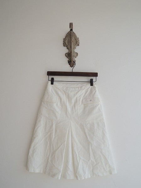 デザイン:mina perhonen 「petal」のコーデュロイスカートです。カラーはオフホワイトで、コーデュロイ素材であしらわれております。左腰フック&ファスナーで着脱でき、フロントにボックスプリーツ&フラップポケットがございます。左ポケットに蝶の刺繍が施され、裏地付きです。