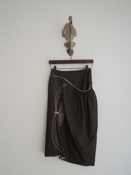 デザイン:mina perhonen 「moon flower」のスカートです。カラーはチャコールブラウンで、ウエスト部は薄らとした中綿入りのキルトステッチが施されております。フロントは共布のカットオフ地の二枚仕立てで、ベージュの刺繍が施されております。左腰のフック&ファスナーで着脱できます。