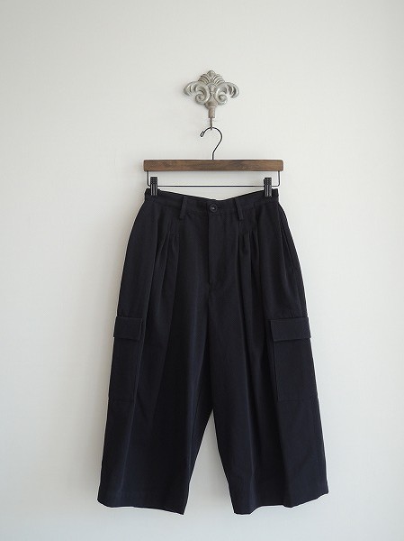 デザイン: mina perhonen 「Au Lait」のワイドパンツです。カラーは濃紺で、フロントボタン&内ボタン&ファスナーで着脱できます。ウエストにタック入りで、ポケットは6つあります。