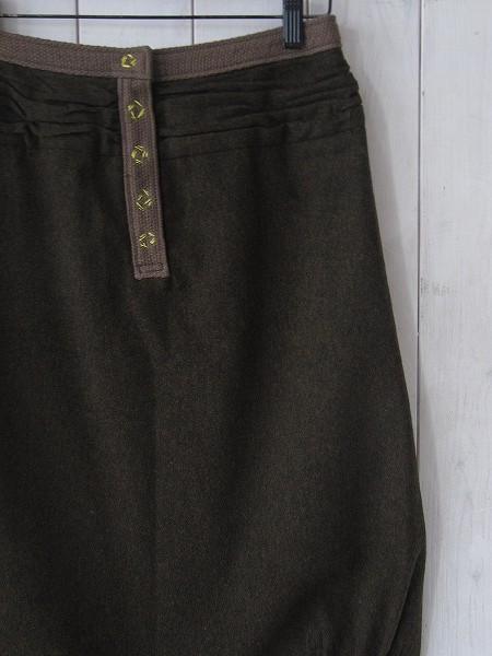 デザイン:mina perhonen 「deep forest」のウールスカートです。カラーはミックスダークグリーン×ブラウンで、フロントスナップボタン、裏地付きです。左サイドに20.5cmほどのスリットが入っており、フロント左裾に9.5cmほどゴムが入っています。定価は34,650円です。