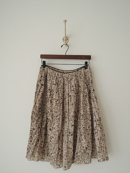 デザイン:mina perhonen 「letter of flower」のギャザースカートです。ピンクベージュベースにカーキの総柄プリントの薄手生地であしらわれており、ウエスト部はギャザー入りでオリーブ色の編みひもが施されております。左サイドのフック&ファスナーで着脱できます。