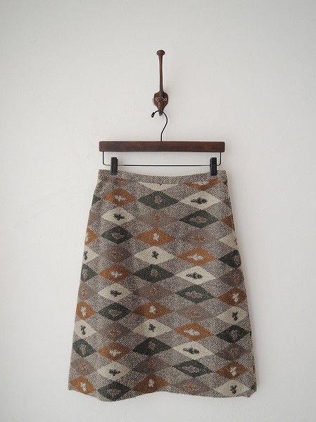 デザイン:mina perhonen 「charades」の刺繍台形スカートです。ベースは緑がかったグレー×グレーベージュのバイヤス織の毛羽のある生地で、ライトブラウン・グリーングレー・グレー・アイボリーの刺繍が全面に施されております。左腰のフック&ファスナーで着脱できます。