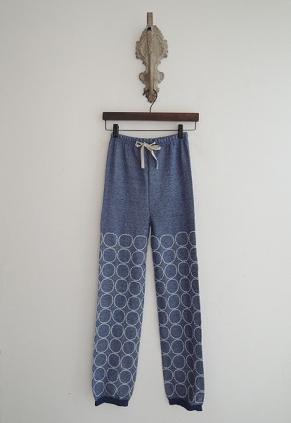 デザイン:mina perhonen「tambourine」のレギンスです。カラーはブルー系で、やや薄手ニット素材であしらわれております。ウエストゴム&ひも入りで、定価10、500円です。 (掲載写真は、実商品のカラーにできるだけ近づけるよう努力はしておりますが、お使いのモニターや画面設定等によっては、色が異なって見える場合もございますので、予めご了承下さい)