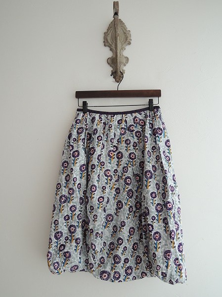デザイン:mina perhonen 「famille」のバルーンスカートです。ホワイトベースにグレー・濃パープル・マスタード・ブルーなどの総柄プリントの薄手生地であしらわれております。ウエストはギャザー入りで濃パープルのパイピングが施されており、裾はゴム入りでバルーンシルエットになっております。左サイドのフック&ファスナーで着脱できます。(掲載写真は、実商品のカラーにできるだけ近づけるよう努力はしておりますが、お使いのモニターや画面設定等によっては、色が異なって見える場合もございますので、予めご了承下さい)