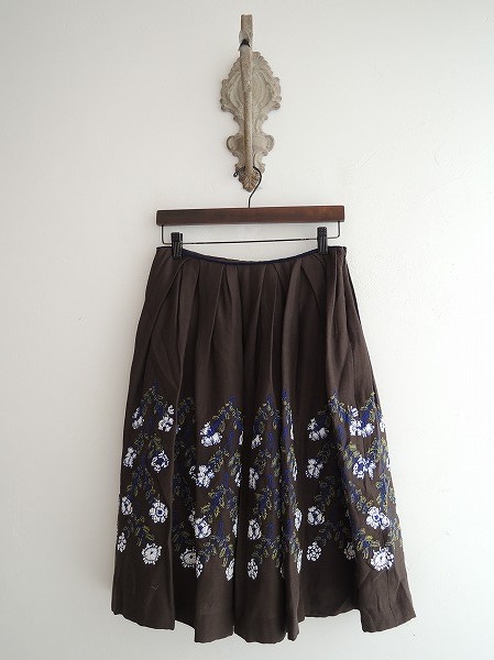デザイン:mina perhonen 「twins」のフレアスカートです。カラーはこげ茶色で、群青色・白・鶯色の刺繍が施されております。ウエスト部はネイビーのボアのパイピングが施されており、左サイドのフック&ファスナーで着脱できます。ウエストにタック入りでフレアなシルエットになっております。定価60900円の商品です。(掲載写真は、実商品のカラーにできるだけ近づけるよう努力はしておりますが、お使いのモニターや画面設定等によっては、色が異なって見える場合もございますので、予めご了承下さい)