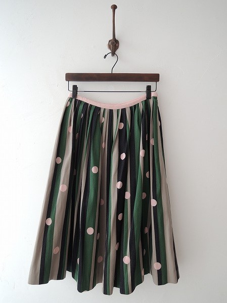 デザイン:mina perhonen 「festival」のフレアスカートです。カラーはグリーン・グレー・ピンク・濃ネイビーで、ストライプ&ドット織の生地であしらわれており、ウエスト部はピンクのパイピングが施されております。ウエストはタック入りでフレアなシルエットになっており、左サイドのフック&ファスナーで着脱できます。(掲載写真は、実商品のカラーにできるだけ近づけるよう努力はしておりますが、お使いのモニターや画面設定等によっては、色が異なって見える場合もございますので、予めご了承下さい)