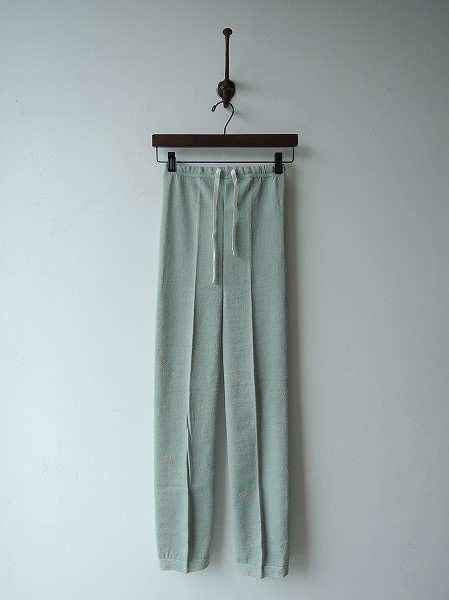 デザイン:mina perhonen 「choucho」のニットスパッツです。カラーはグリーングレーで、ライトグレー&ゴールドラメで柄編みが施されております。ウエストは総ゴムです。(掲載写真は、実商品のカラーにできるだけ近づけるよう努力はしておりますが、お使いのモニターや画面設定等によっては、色が異なって見える場合もございますので、予めご了承下さい)