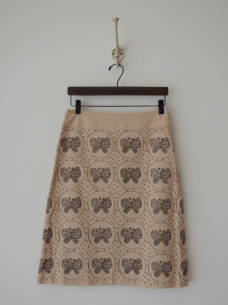 デザイン:mina perhonen 「forest wing」の台形スカートです。カラーはピンクベージュで、濃グレーの刺繍が全面に施されております。ウエスト部はライトベージュのドット状の刺繍が施されており、左サイドのフック&ファスナーで着脱できます。(掲載写真は、実商品のカラーにできるだけ近づけるよう努力はしておりますが、お使いのモニターや画面設定等によっては、色が異なって見える場合もございますので、予めご了承下さい)