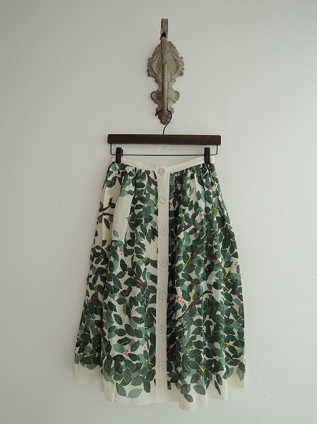デザイン:mina perhonen 「nap」のリネンフレアスカートです。カラーはアイボリーベースに 緑系×濃茶×オレンジ×黄×濃ピンクの葉柄&シルバー箔プリントが施されております。フロントボタン開閉で着脱でき、ウエスト周りにギャザーがあしらわれております。付属のペチコートは左腰のボタン&スナップボタンで着脱できます。(掲載写真は、実商品のカラーにできるだけ近づけるよう努力はしておりますが、お使いのモニターや画面設定等によっては、色が異なって見える場合もございますので、予めご了承下さい)