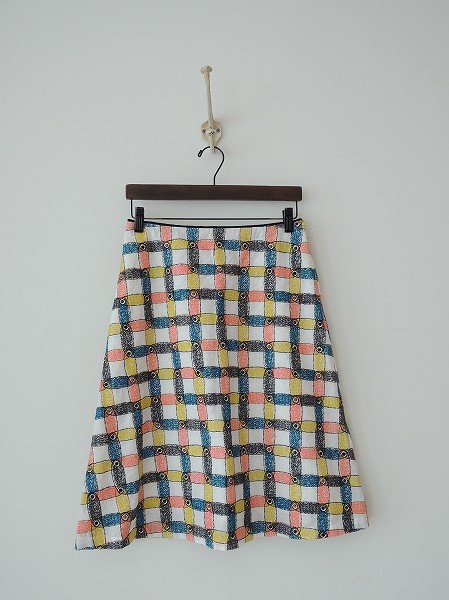 デザイン:mina perhonen「cantuccio」のスカートです。カラーはホワイトベースに、イエロー・サーモンピンク・ブラック・ブルー系などで刺繍が施され、左腰フック&ファスナーで着脱できます。裏地付きです。(掲載写真は、実商品のカラーにできるだけ近づけるよう努力はしておりますが、お使いのモニターや画面設定等によっては、色が異なって見える場合もございますので、予めご了承下さい)