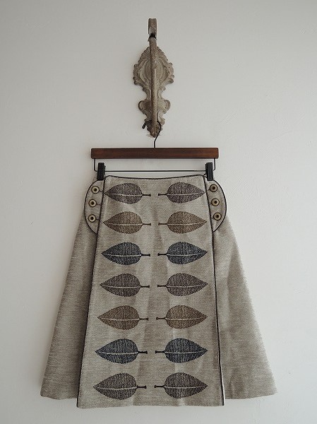デザイン:mina perhonen 「happa」の刺繍スカートです。カラーはグレーで、光沢感のあるモール地であしらわれており、濃ブラウン系のスウェードの三つ編みテープでパイピングが施されております。両腰のボタンで着脱でき、濃ブラウン・カーキ・ネイビーの葉っぱ刺繍があしらわれております。フロントはボックスプリーツデザインになっており、裏地付きです。(掲載写真は、実商品のカラーにできるだけ近づけるよう努力はしておりますが、お使いのモニターや画面設定等によっては、色が異なって見える場合もございますので、予めご了承下さい)