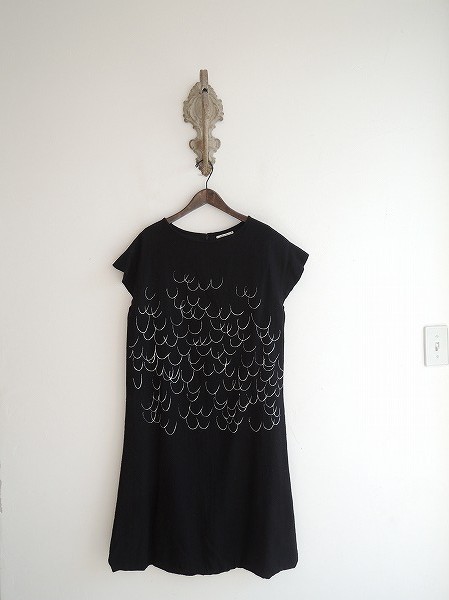 デザイン:mina perhonen 「plume」のプリントワンピースです。 カラーはブラックで、毛羽のある生地であしらわれており、ホワイトのフロッキープリントが施されております。裾は少しバルーンのようなシルエットになっており、背上部のフック&ファスナーで着脱できます。定価46,200円です。