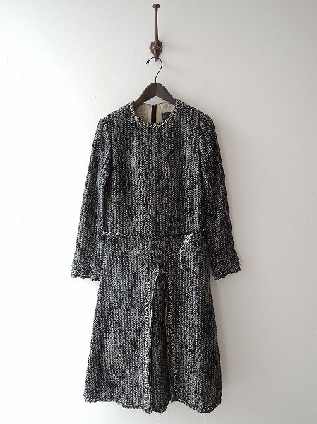 デザイン:mina perhonen 「mica」のワンピースです。カラーはブラック、ホワイト、シルバーのミックス織りで、襟ぐりにアイボリーのステッチがあしらわれています。背中のフックとファスナーで着脱できます。裾は裁ち切りで、メッシュ素材の裏地付きです。