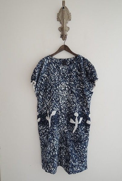 デザイン::mina perhonen 「wind dance」のワンピースです。オフホワイトベースにネイビーのプリント入りの素材であしらわれております。ウエスト辺りまでの比翼ボタン半開で、袖口にゴムが入っております。両腰にポケット付きで、定価52500円です。 (掲載写真は、実商品のカラーにできるだけ近づけるよう努力はしておりますが、お使いのモニターや画面設定等によっては、色が異なって見える場合もございますので、予めご了承下さい)