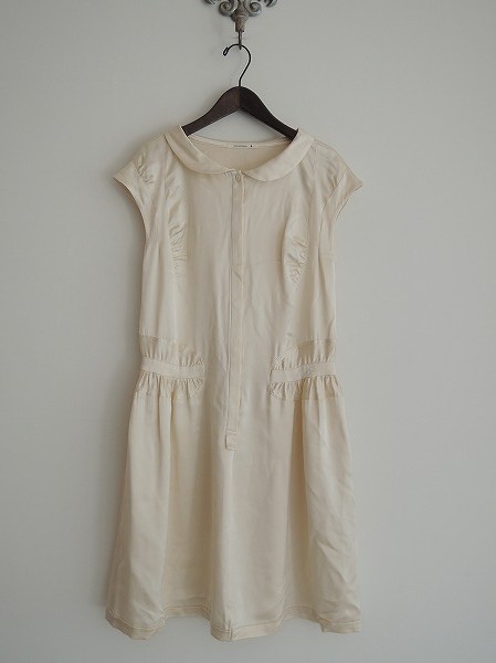 デザイン:mina perhonen 「pearl」のシルクワンピースです。カラーは光沢感のあるアイボリーで、ウエスト辺りまでの比翼ボタン半開です。左腰に蝶の刺繍があしらわれており、裏地はございません。 (掲載写真は、実商品のカラーにできるだけ近づけるよう努力はしておりますが、お使いのモニターや画面設定等によっては、色が異なって見える場合もございますので、予めご了承下さい)