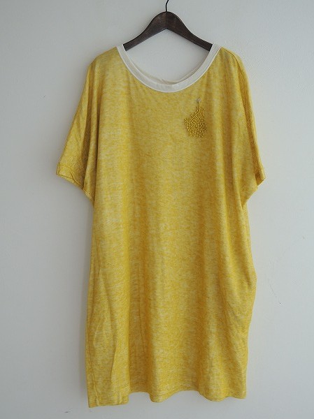 デザイン:mina perhonen 「wafer」のワンピースです。カラーはイエローで、外側はリネン地で内側は肌触りのよいコットン地の二重編みであしらわれております。袖丈は五分くらい、やや幅広のシルエットになっており、左胸に刺繍モチーフがあしらわれております。両腰にシームポケット付きで、定価28350円の商品です。(掲載写真は、実商品のカラーにできるだけ近づけるよう努力はしておりますが、お使いのモニターや画面設定等によっては、色が異なって見える場合もございますので、予めご了承下さい)
